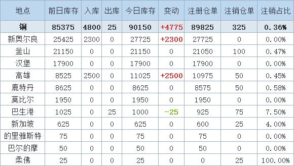 外电8月15日消息,以下为8月15日LME铜库存在全球主要仓库的分布变动情况:8月15日LME铜库存增加4775吨,其中,新奥尔良铜库存增加2300吨,高雄铜库存增加2500吨,巴生港铜库存减少25吨。8月15日累计增加铜库存4775吨。8月15日LME铜仓库最新库存数据为90150吨。