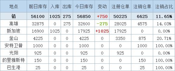 8月16日LME铅库存增加750吨,新加坡库存增幅盖过高雄库存降幅,新加坡仓库累库1025吨,高雄仓库去库275吨,总计累库750吨。截止8月16日,LME铅最新库存数据为56850吨。