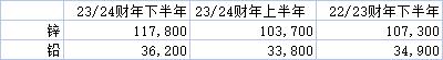 以下是该公司铅锌生产计划的细节,并与2023/24财年上半年的预估产量和截至3月31日的2022/23财年下半年的实际产量进行了比较。(单位为吨)