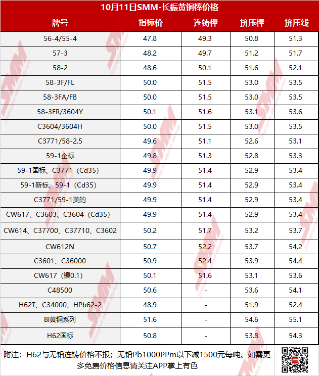 【SMM价格】2023年10月11日长振黄铜棒价格