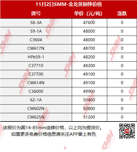 【SMM价格】2023年11月2日金龙黄铜棒价格