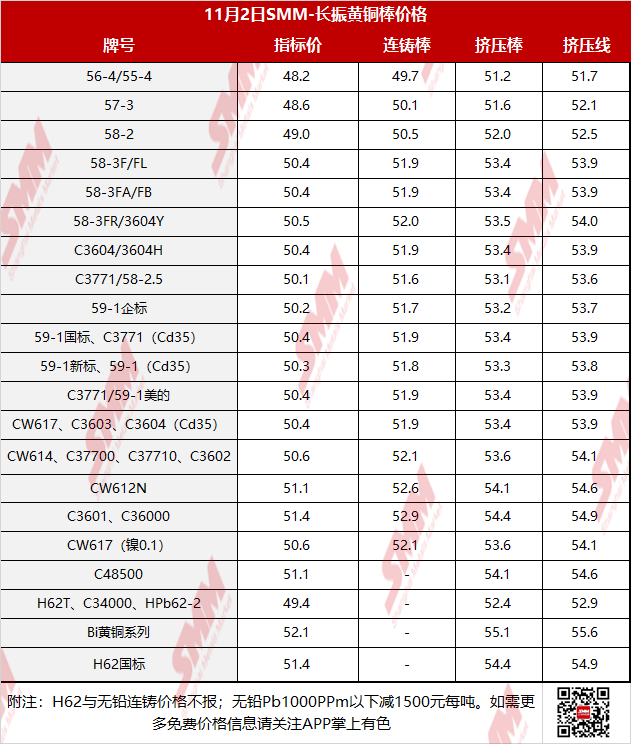 【SMM价格】2023年11月2日长振黄铜棒价格