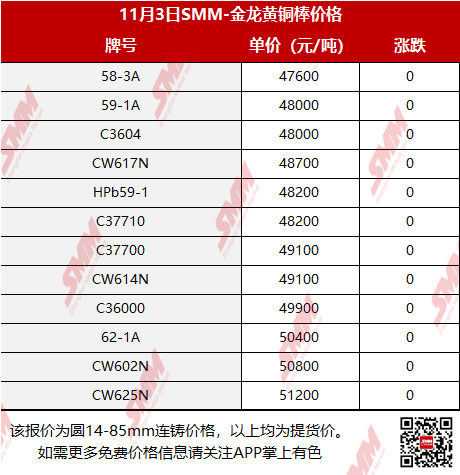 【SMM价格】2023年11月3日金龙黄铜棒价格