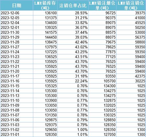 此前LME铅库存不断拉升,于11月底一度升至14万吨之上水平,随后高位回落,昨日又出现增加一幕。注册仓单已经提前出现反弹,目前延续增势,注销占比上月一度大幅拉升,目前高位回落。