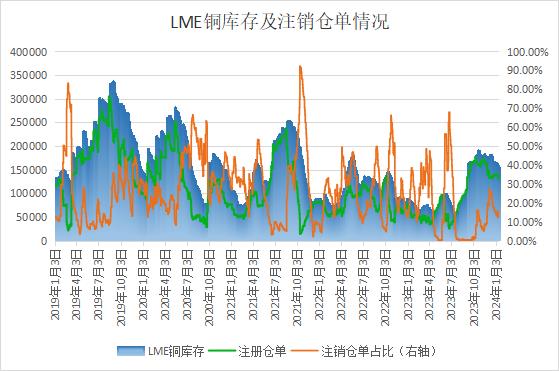 LME公布的数据显示,LME铜注销仓单停止下滑,目前略有反弹至24575吨,注销占比回升至15.85%。注册仓单仍呈现震荡下滑姿态,目前降至130450吨。