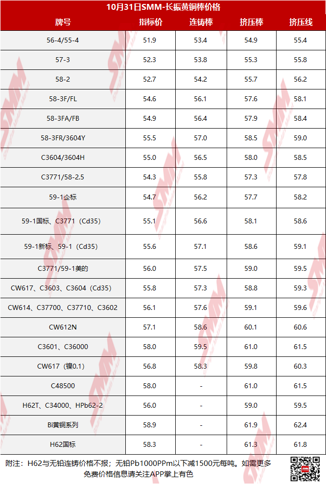【SMM价格】2024年10月31日金龙黄铜棒价格