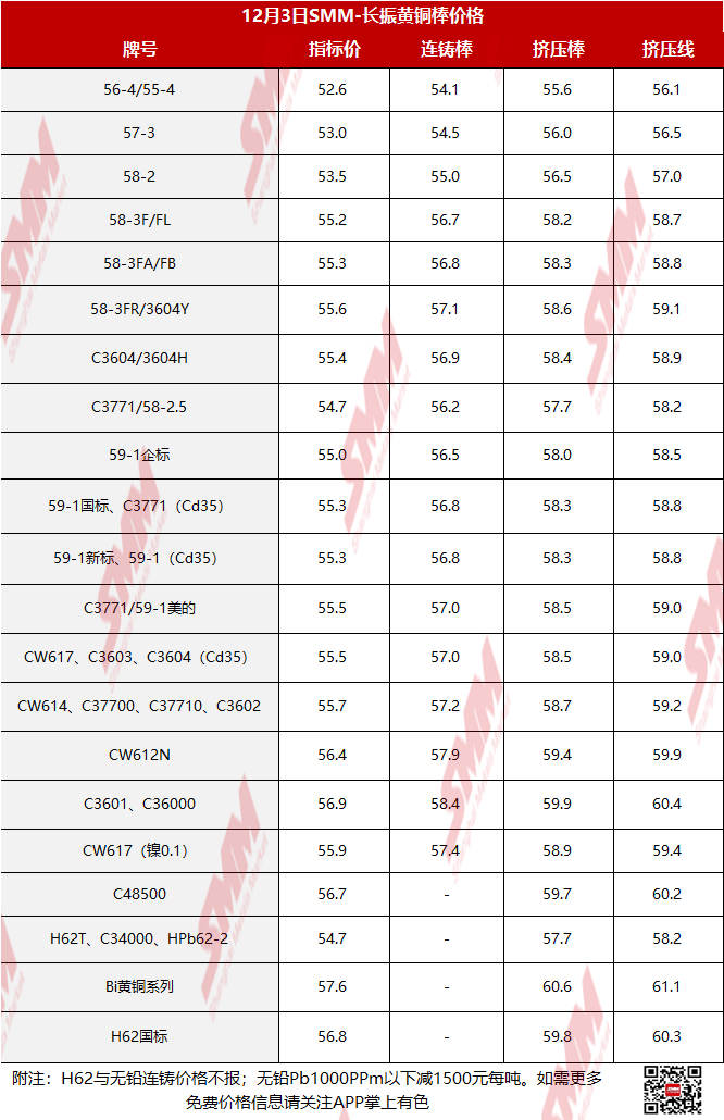 【SMM价格】2024年12月3日长振黄铜棒价格