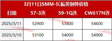 【SMM价格】2025年3月11日长振黄铜棒价格