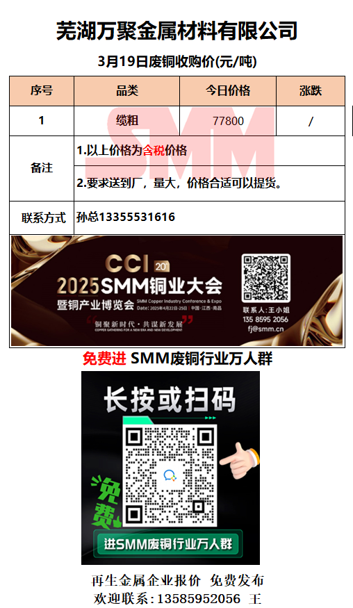 今日芜湖万聚金属 废铜采购报价已更新,有货的朋友欢迎联系我们!