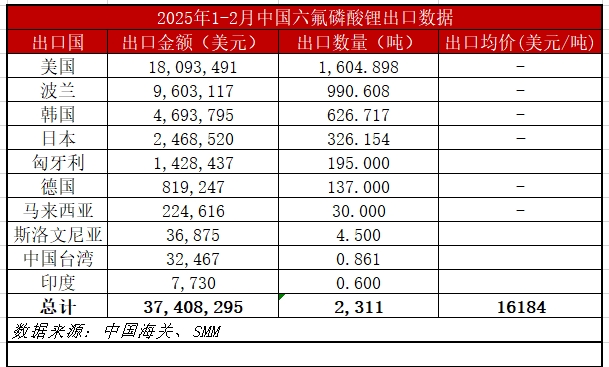 根据中国海关数据显示,2025年1月,中国六氟磷酸锂累计出口量为2430吨,环比上升约13.5%,2月中国六氟磷酸锂累计出口量为1486吨,环比下降约38.8%。其中,1月中国六氟磷酸锂累计进口量为0.002吨,2月中国六氟磷酸锂累计进口量为8.134吨。