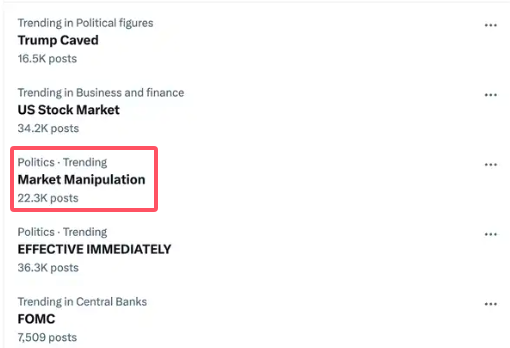 据悉,自美东时间周三下午1:20起,有关“市场操纵”的特定短语就在Google上搜索量激增,该词也已成为了X平台上的热门话题。