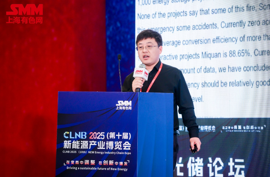 SMM储能资深顾问叶明远围绕“全球储能市场发展机遇及挑战”的话题展开分享。他表示,全球储能需求由于中美政策方向调整增速有所放缓,预计2025年增速约为5%;2025年后,全球储能规划逐步完成,储能逐渐转入存量市场,中美市场转型的成功或将导致增速回升,推动全球储能市场以10%复合增速上行。SMM预计,中国储能市场2025年到2030年复合年增长率预计在9.5%左右,北美市场从2025年到2030年,储能市场年复合增长率将达7.4%左右,2025年到2030年,欧洲储能市场复合年增长率有望达到23.4%左右。