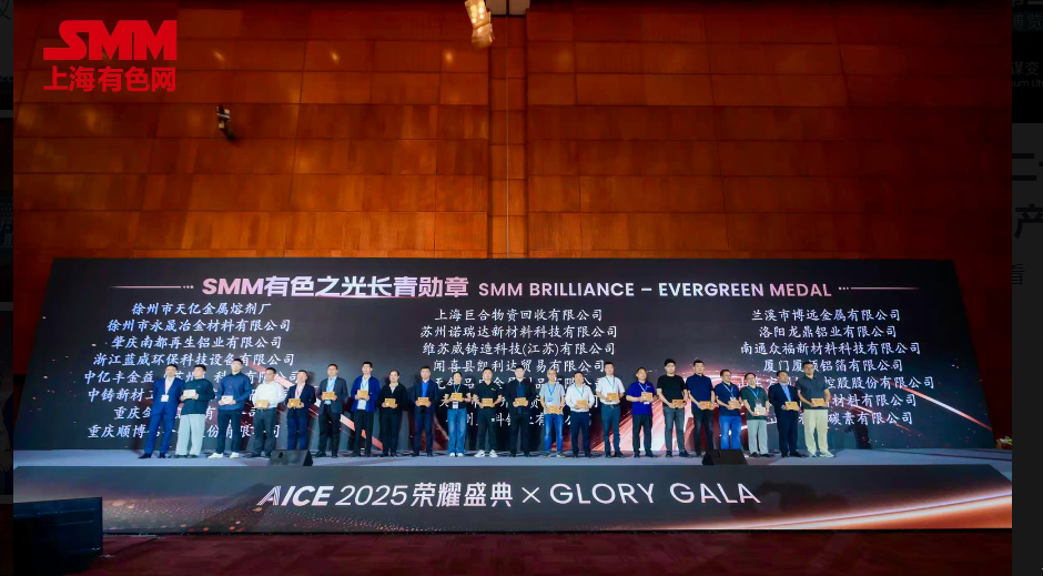 为答谢多年来始终坚定支持 SMM 铝业博览会的企业,致敬大家风雨同舟的深厚情谊与毫无保留的鼎力支持,SMM特设立“有色之光长青勋章奖” ,并在由SMM主办,中亿丰金益科技(苏州)科技有限公司、乐至县乾润招商服务有限公司协办,上栗县科源冶金材料有限公司、广东齐力澳美高新材料股份有限公司、大正金屬(控股)有限公司、金桥轻合金科技(江门)有限公司等单位为论坛冠名,索通发展股份有限公司、上海嘉朗实业有限公司为论坛协办,以及各特邀支持单位、大会支持单位、大会呜谢单位和各媒体单位支持的AICE 2025 SMM(第二十届)铝业大会暨铝产业博览会上授予以下企业 “2025SMM有色之光长青勋章奖” ,以此铭记这段珍贵的合作历程,褒扬各企业作出的卓越贡献 。