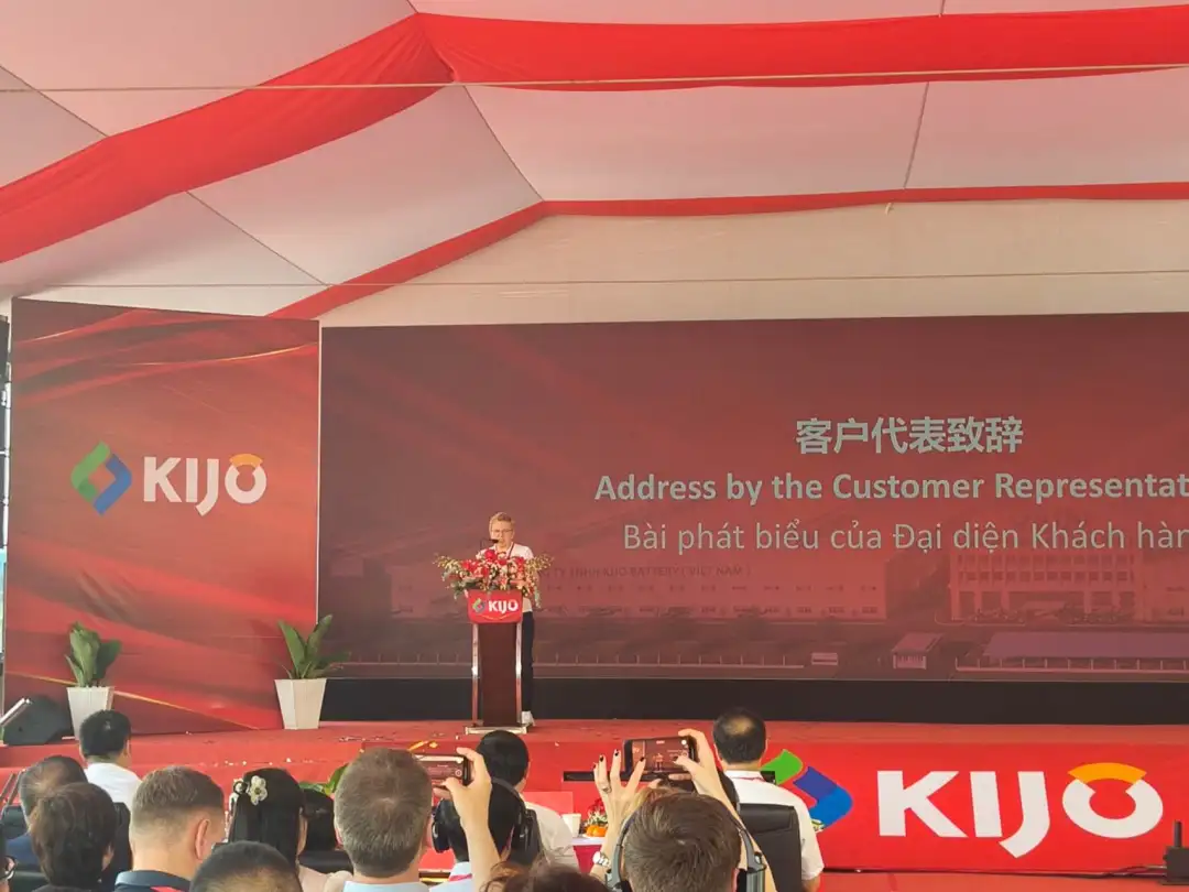 紧接着,京九集团总裁吴明耀先生发表重要讲话,他首先回顾了京九集团 32 年的发展历程,从中国南昌起步,如今已发展成为拥有六大生产基地、八家营销公司的全球化新能源电池企业。吴明耀先生重点介绍了越南项目的战略意义:越南公司总投资 1 亿美元,分两期建设,建成后将形成 12 万吨(5GWh)产能,预计年产值达 3 亿美元。
