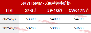 【SMM价格】2025年5月7日长振黄铜棒价格