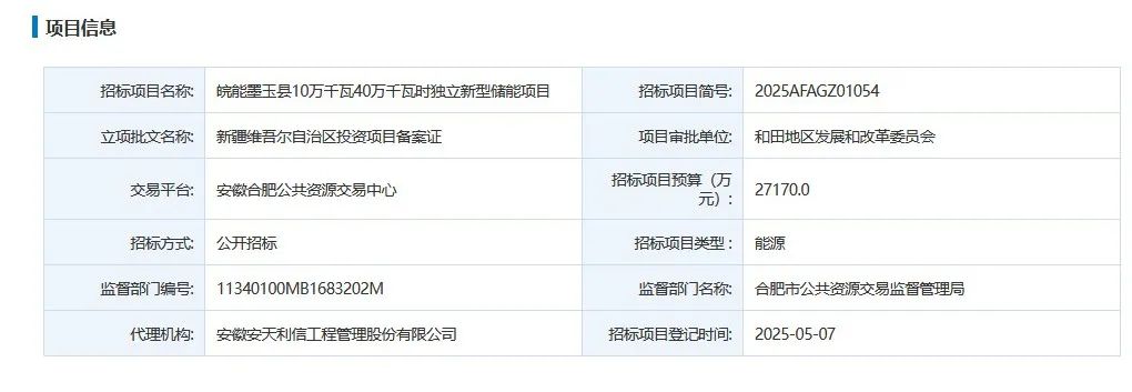北极星储能网讯:5月7日,皖能新疆墨玉县100MW/400MWh独立新型储能项目招标发布,招标人为安徽省皖能聚合智慧能源有限公司。招标项目预算27170万元,折合单价约0.68元/Wh。