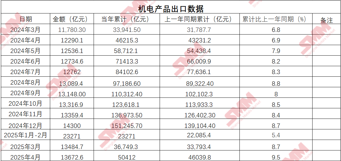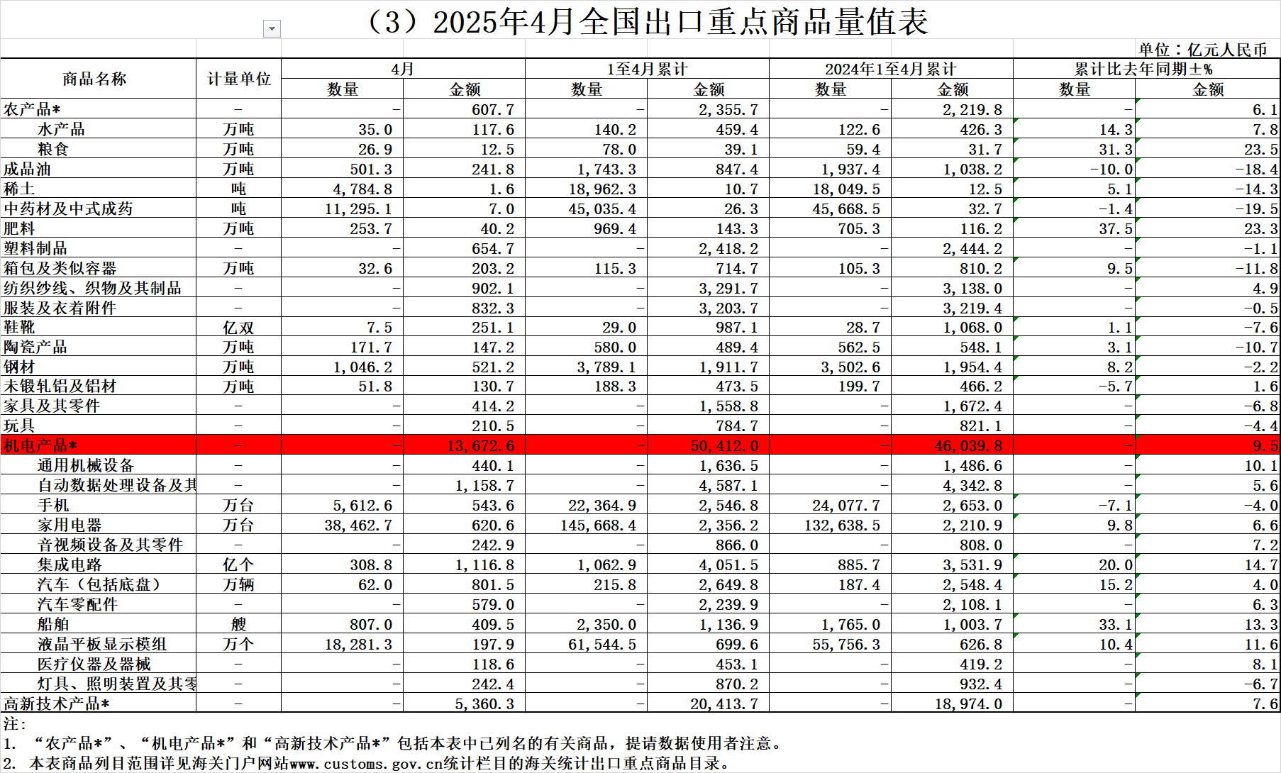 编者按:2025年前4个月,我国货物贸易进出口总值14.14万亿元人民币,同比增长2.4%。前4个月,我国出口机电产品5.04万亿元,占我出口总值的60.1%!前4个月,我国机电产品进出口均出现增长,而出口机电产品的增幅更是高达9.5%,创年内最大增幅!一季度出口的机电产品中,自动数据处理设备及其零部件、集成电路、汽车、家电、液晶平板显示模组以及船舶等均有明显增长!
