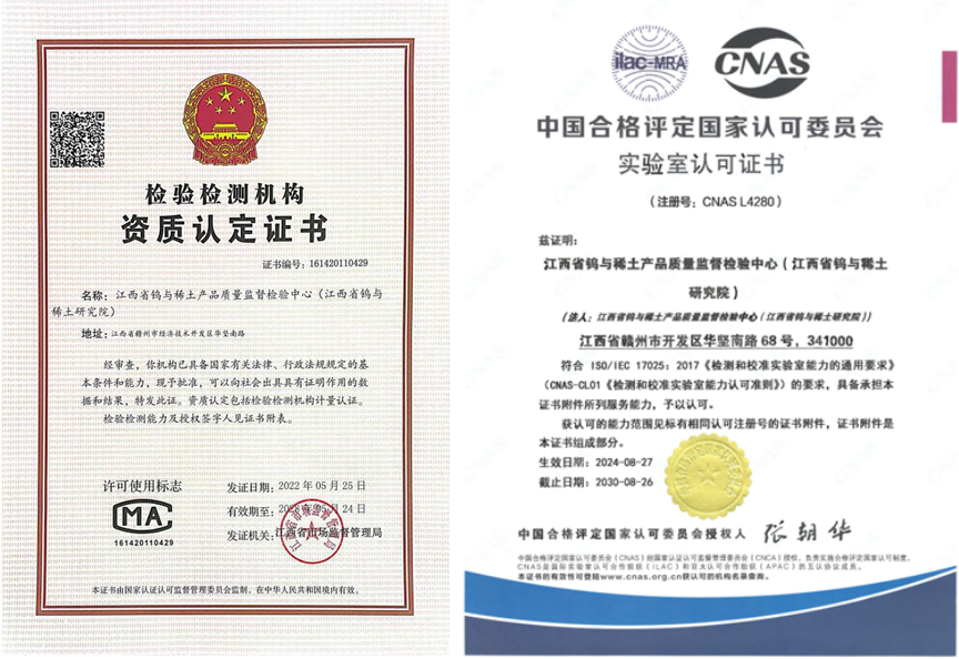 国家钨与稀土产品质量检验检测中心(江西省钨与稀土研究院)是2009年9月批准成立的江西省市场监督管理局直属正处级事业单位,2023年获批成立了江西省稀有金属新材料产品质量监督检验中心。中心现有人员75人,其中博士1人、在读博士2人,硕士21人;中高级职称30人;并广泛与中国科学院金属研究所、中国科学院赣江创新研究院、中南大学、江西理工大学和赣南师范大学等科研院所深入合作,柔性引进博士以上专家30余人。