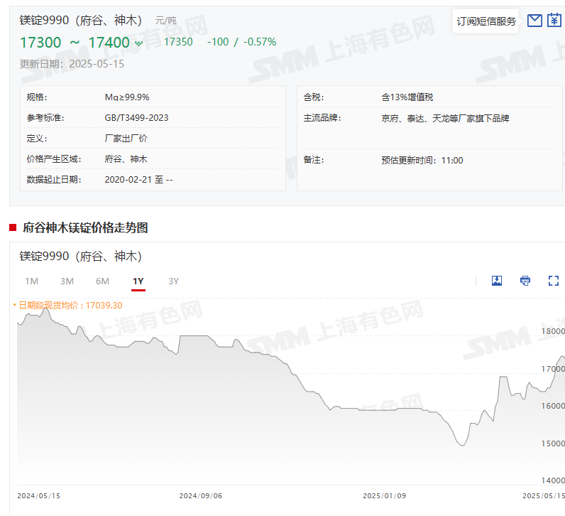 进入2025年以来,随着供需格局扭转,镁锭厂家库存持续下降,镁价自3月中旬起开始一改此前弱势运行的态势,整体呈现了平稳回升的走势。据SMM报价显示,5月15日,SMM镁锭9990(府谷、神木)报17300~17400元/吨,其均价为17350元/吨,这一均价较前一交易日回落了100元/吨,而与3月7日的前期低点15050元/吨,上涨了2300元/吨,涨幅为15.28%。