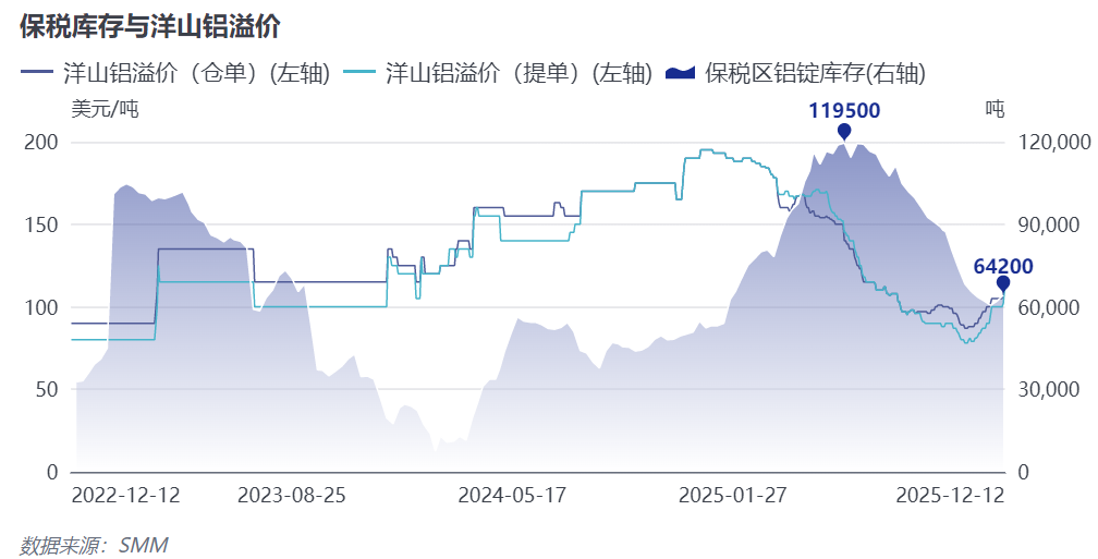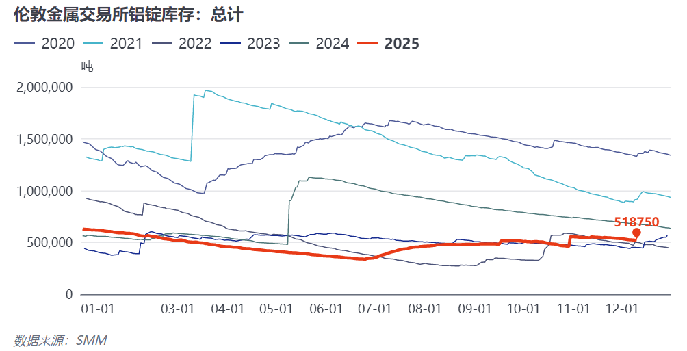2025年四季度以来,全球铝溢价呈现 “欧美强、亚洲弱” 的极端分化格局:美国中西部完税后铝溢价突破1940美元/吨,欧洲鹿特丹港未完税P1020A 铝锭升水至260美元/吨(较9月初涨幅62.5%),而日本MJP4季度升水仅 86美元/吨、中国现货溢价因加工贸易窗口关闭大幅下滑。价差驱动跨区域套利,亚洲铝锭资源持续流向欧美,直接导致亚洲进口供应收缩。截至2025年 12月,中国保税区铝库存较年内高位下降50%,LME亚洲区域库存同步处于低位,为MJP升水反弹奠定基础。