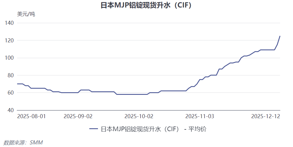 2025年12月,两大铝冶炼厂已针对2026年一季度发往日本的铝锭给出190美元/吨、203美元/吨的报盘,较2025年四季度98-103美元/吨的报价环比上涨48%-49%。报盘大幅上调既反映了供应端成本与紧张预期,也预示着市场谈判格局已从2025年四季度的买方主导,转向2026年一季度的卖方主导,进一步确认升水上涨的确定性。