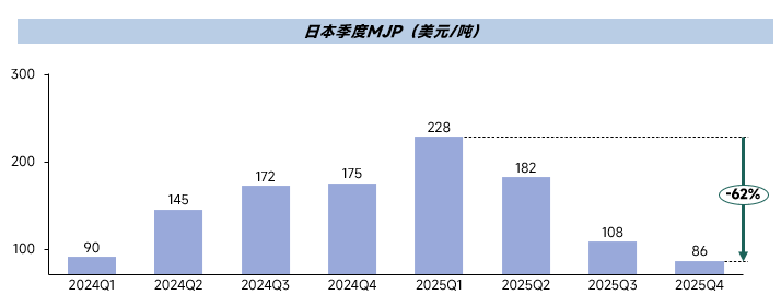 2026年一季度日本MJP(主要港口)铝锭升水将摆脱2025年四季度86美元/吨的年内低位,重心上涨。核心逻辑源于全球铝贸易流向重构引发的亚洲供应收紧,叠加欧洲碳政策催化与结构性需求支撑,头部冶炼厂最新报盘已提前印证上涨趋势,但日本财务年收尾带来的备库约束可能限制反弹幅度。具体分析如下: