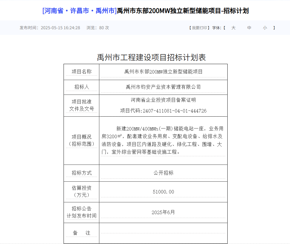 北极星储能网获悉,5月15日河南省许昌市禹州市东部200MW独立新型储能项目公开招标招标计划,