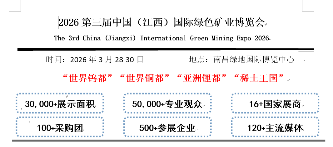 为了助力江西新时期矿山行业健康持续发展,加快推动新产品、新技术、新装备广泛应用。2026第三届中国(江西)国际绿色矿业博览会,将于2026年3月28-30日在南昌绿地国际博览中心举行。届时邀请政府领导、专家学者、企业高管、协会领导等一道解析行业发展形势,挖掘新动能,探寻发展思路,共同打造“创新、合作、发展、共赢”的全球矿业合作平台。