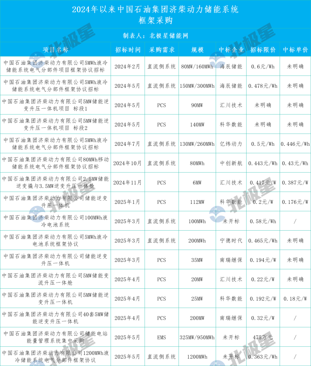 据北极星储能网统计,自2024年以来,中国石油济柴动力先后发布多批储能设备采购需求,其中直流侧储能系统7个标段、总规模2.3GWh;PCS 共8个标段,采购规模628MW;EMS共采购4套,涉及规模325MW/950MWh。