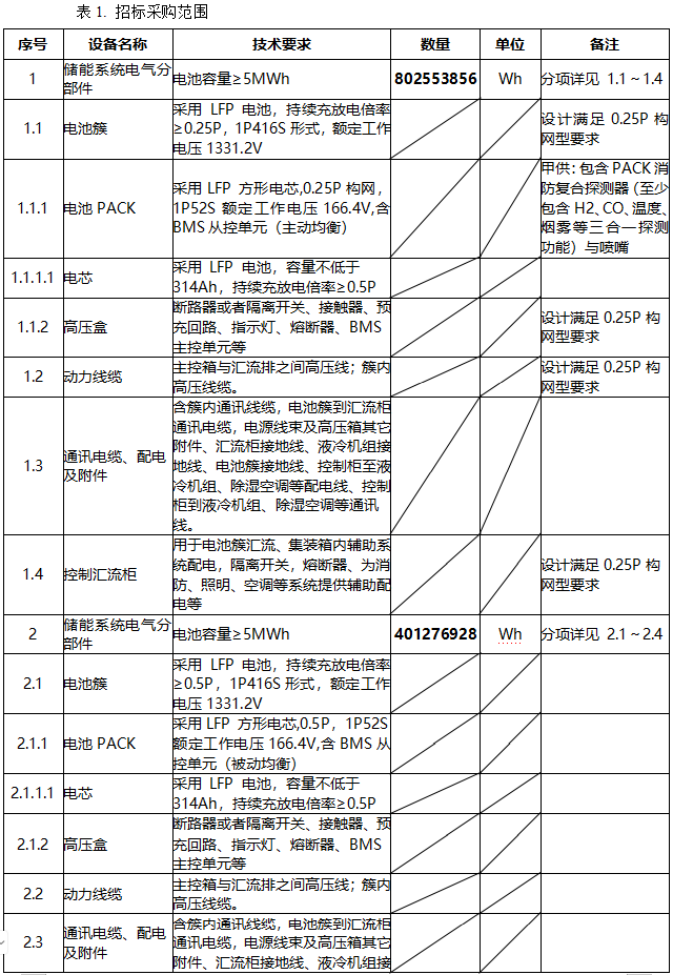 而在本次1200MWh储能直流侧采购中,明确要求系统具备0.25P构网能力。采购范围包括磷酸铁锂电池、电池模块、电池管理系统、高压盒、控制汇流柜等,要求采用不低于314Ah的磷酸铁锂电池,并以安全可靠的实现化学能和电能相互转化的基本单元。