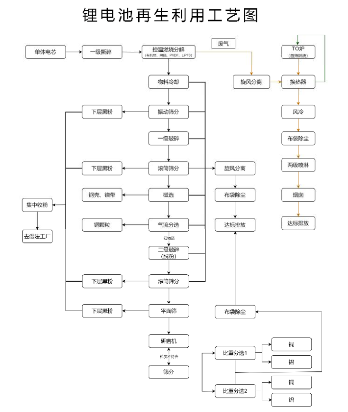 4.回收效率高:控温燃烧+物理多梯度分选,铜铝箔高效剥离技术,黑粉中Cu杂质含量<0.5%,定向除氟,黑粉价值更优。