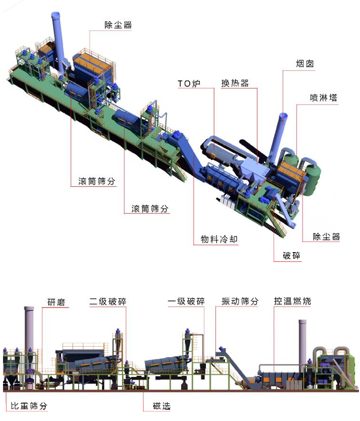 废旧锂电池回收处理设备主要由撕碎系统、热解系统、分离系统、尾气处理系统以及智能化操作系统等组成: