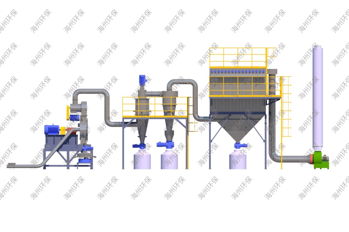 锂电池正负极片废料在负压条件下进入进入剥离主机后,通过内部的剪切及揉搓力把附着在极片上的黑粉与铝箔、铜箔分离,通过内置分级转子,将粒径不同的物料分成两部分,一部分合格的黑粉进入旋风收集器收集,第二部分金属箔经剥离机底部的排渣通道排入筛分机,分出金属箔和少量黑粉。小部分超微粉尘进入除尘器进行收集,确保引风机排出的气体中的粉尘达标排放,通过干法剥离、精细分离可实现对废锂电池负极材料中金属铜与碳粉的资源化利用。