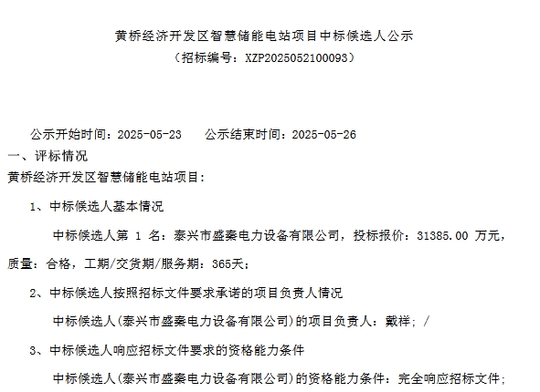 北极星储能网获悉,5月23日,黄桥经济开发区智慧储能电站项目中标候选人公示。项目招标人为江苏金桥建设有限公司,本工程拟利用江苏泰兴黄桥经济开发区内企业现有场地建设储能电站,规划安装容量为100MW/300MWh。本期储能电站采用全预制舱布量形式,户外放置100个3MWh储能电池舱。泰兴市盛秦电力设备有限公司以31385万元中标该项目,折合单价1.046元/Wh。