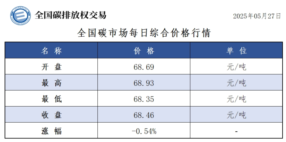 今日全国碳市场综合价格行情为: 开盘价68.69元/吨,最高价68.93元/吨,最低价68.35元/吨,收盘价68.46元/吨,收盘价较前一日下跌0.54%。