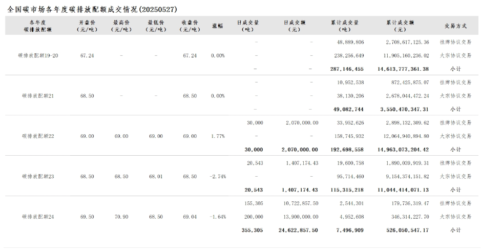 截至2025年5月27日,全国碳市场碳排放配额累计成交量651,739,884吨,累计成交额44,697,785,531.41元。
