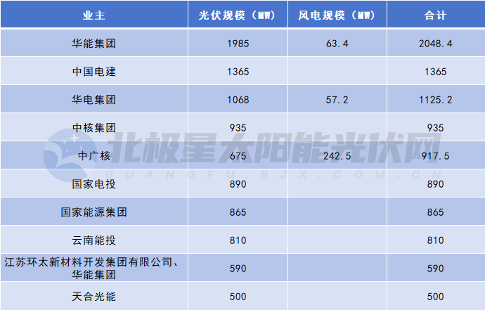 具体到业主来看,华能集团所获规模最大,超2GW;中国电建、华电集团所获规模超1.1GW;中核集团、中广核、国家电投、国家能源集团、云投集团等亦有所获;此外,在民营企业中,天合光能、环太新材所获指标居前。排名前十的企业详情见下:
