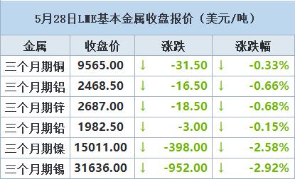 伦敦时间5月28日17:00(北京时间5月29日00:00),LME三个月期铜收低31.5美元或0.33%,收报每吨9,565美元,盘初触及两周高点9,655美元。