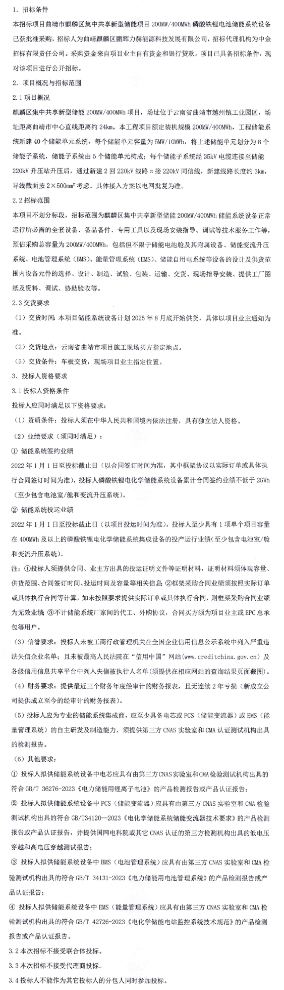 5月30日,曲靖麒麟区鹏辉力赫能源科技发展有限公司发布曲靖市麒麟区集中共享新型储能项目200MW/400MWh磷酸铁锂电池储能系统设备集中采购招标公告。项目场址位于云南省曲靖市越州镇工业园区,场址距离曲靖市中心直线距离约24km。本工程项目额定装机规模200MW/400MWh,工程储能系统新建 40个储能单元系统,每个储能单元容量为5MW/10MWh,将上述储能单元划分为8个储能子系统,储能子系统由5个储能单元构成;每个储能子系统经35kV电缆连接至储能220kV 升压站升压后,通过新建2回220kV线路π接220kV同信线,新建线路长度约3km,导线截面按 2x500mm2考虑。具体接入方案以电网批复为准。