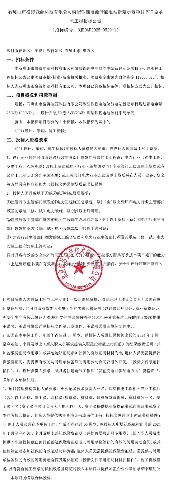 5月30日,石嘴山市格得能源科技有限公司磷酸铁锂电池储能电站新建示范项目EPC总承包工程招标公告发布。项目位于宁夏石嘴山市惠农区,项目规划额定容量250MW/1000MWh,共设计安装50套5MW/20MWh磷酸铁锂电池储能系统单元。