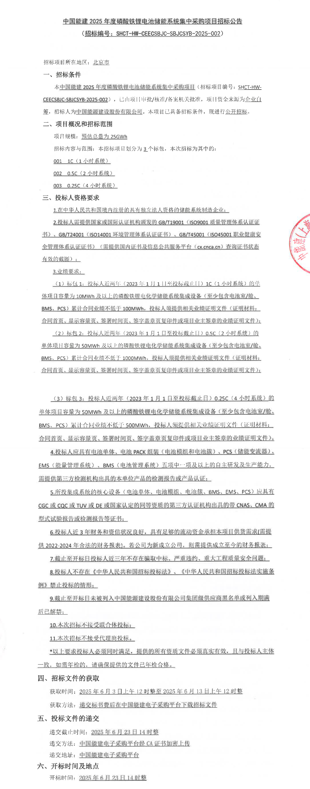 北极星储能网讯:6月3日,中国能建2025年度磷酸铁锂电池储能系统集中采购项目招标公告,预估总量为25GWh。