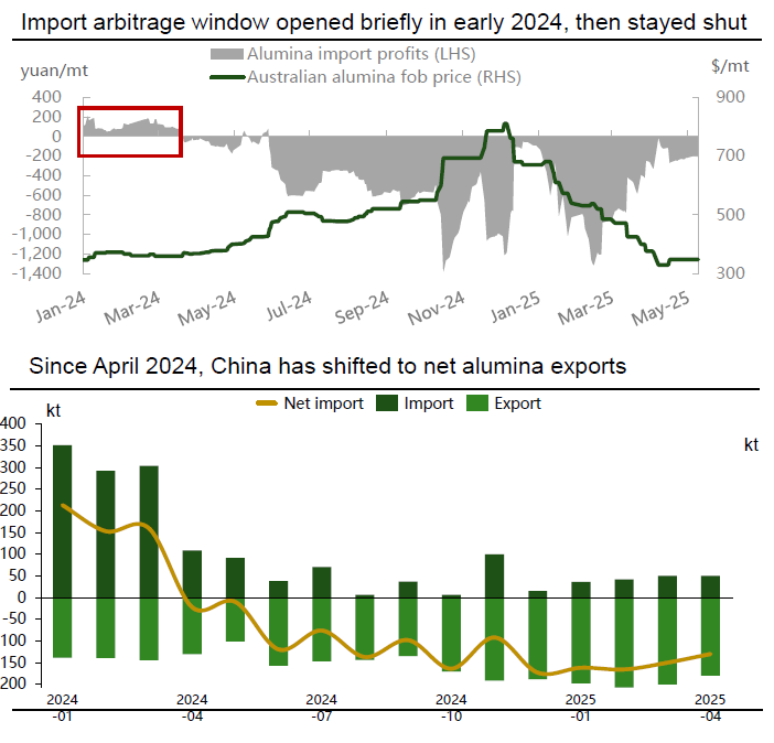 2024年初,进口套利窗口短暂开启后又关闭。且自2024年4月起,我国已转为氧化铝净出口。