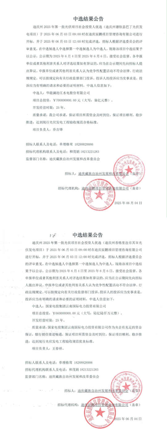 6月4日,云南迪庆州2025年第一批光伏项目投资人中选结果公告发布,此次公示的两个项目分别国家电投集团云南国际电力投资有限公司、华能澜沧江水电股份有限公司获得。