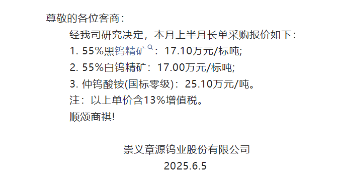 据崇义章源钨业6月5日消息:崇义章源钨业股份有限公司6月上半月长单采购报价如下: 1. 55%黑钨精矿:17.1万元/标吨,较上轮报价上调0.75万元/标吨;2. 55%白钨精矿:17万元/标吨,较上轮报价上调0.75万元/标吨;3. 仲钨酸铵(国标零级):25.1万元/吨,较上轮报价上调0.8万元/吨。