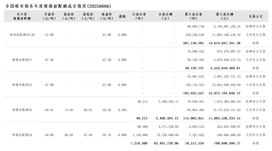 2025年1月1日至6月6日,全国碳市场碳排放配额成交量24,960,504吨,成交额1,900,351,077.32元。