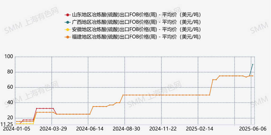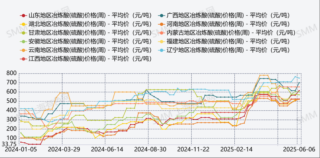 从2024年以来中国铜冶炼厂的硫酸价格就在持续走高,硫酸价格的趋势与铜精矿现货加工费的趋势形成鲜明对比。
