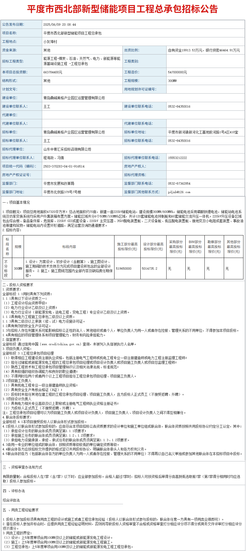 6月9日,山东平度市西北部300MW/600MWh新型储能项目工程总承包招标公告发布。工程造价547000000元,折合单价0.912元/Wh。