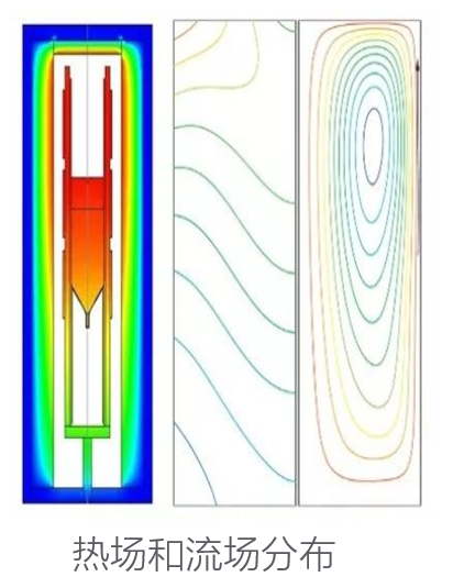 流场分布(右侧图):展示了熔体内的流场分布,流场的分布影响熔体的对流和热传递,通过控制流场,可以优化晶体生长条件,提高晶体的纯度和均匀性。