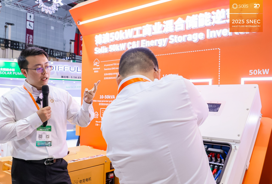在50kW工商业混合储能逆变器展区,锦浪Solis通过实际运行发电机以及现场拆解演示,真实还原了产品的应用场景,完美展现了技术与实际应用的结合,极大地提升了观众的观展体验。