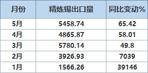 6月16日(周一),印尼贸易部周一公布的数据显示,该国今年5月精炼锡出口量同比大幅增加65.42%,至5,458.74吨,同时也高于上个月的4,865.87吨。